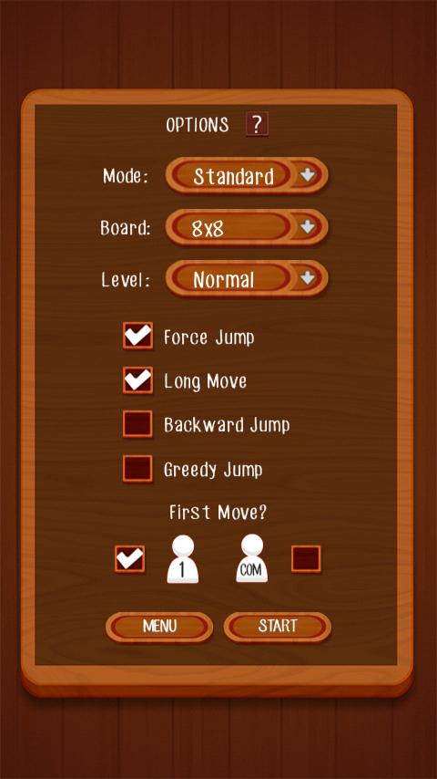 The objective is similar to the standard Checkers/Draughts i.e., to capture all opponent's pieces or to force the opponent to have no more legal moves. Three modes are provided; the Standard mode (Dam Haji), Giveaway mode (Dam Suap) and Kapit mode (Dam Kapit). It can be played either using 8x8 (24 pieces), 10x10 (40 pieces) or 12x12 (30 pieces) board sizes. The rules can be set to suit your game play before starting any match. The game offers you to play either against Android (CPU) or with a friend using a same device.